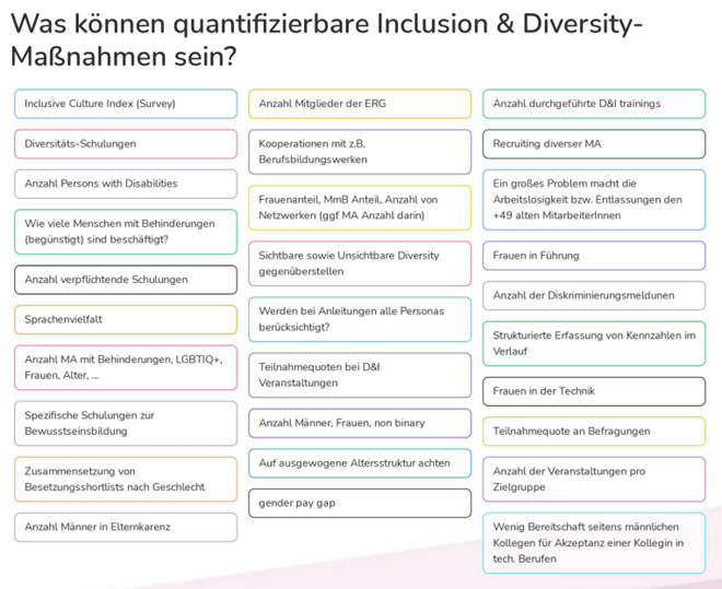 Mit den Worten „Egal aus welcher Richtung eine Maßnahme kommt, sie zahlt auf den Menschen ein“ und der Verknüpfung mit dem Employee Life Cycle wurde der Inputteil abgerundet, bevor es nach einem interaktiven Teil zum Austausch über quantifizierbare Inklusions- und Diversitätsmaßnahmen (Inhalte nachstehend zu finden) zu dem heutigen Good Practice-Beispiel von Greiner überging.