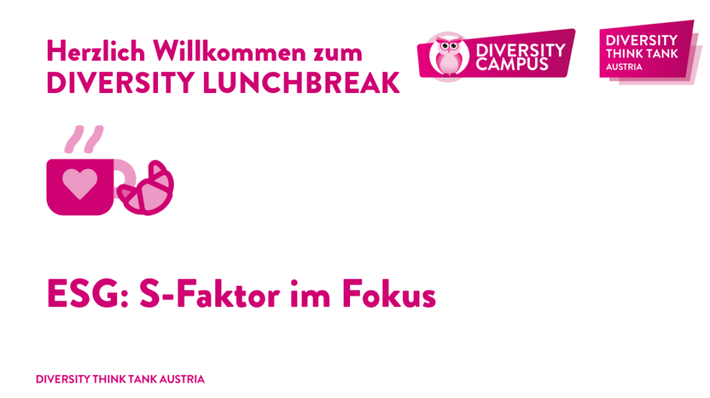 Bei unserem diesjährigen Diversity Lunchbreak, am 14.03.2024, mit rund 90 interessierten Teilnehmer:innen beschäftigten wir uns mit dem aufstrebenden Thema ESG und insbesondere mit der Synergie vom S-Faktor und Diversität.