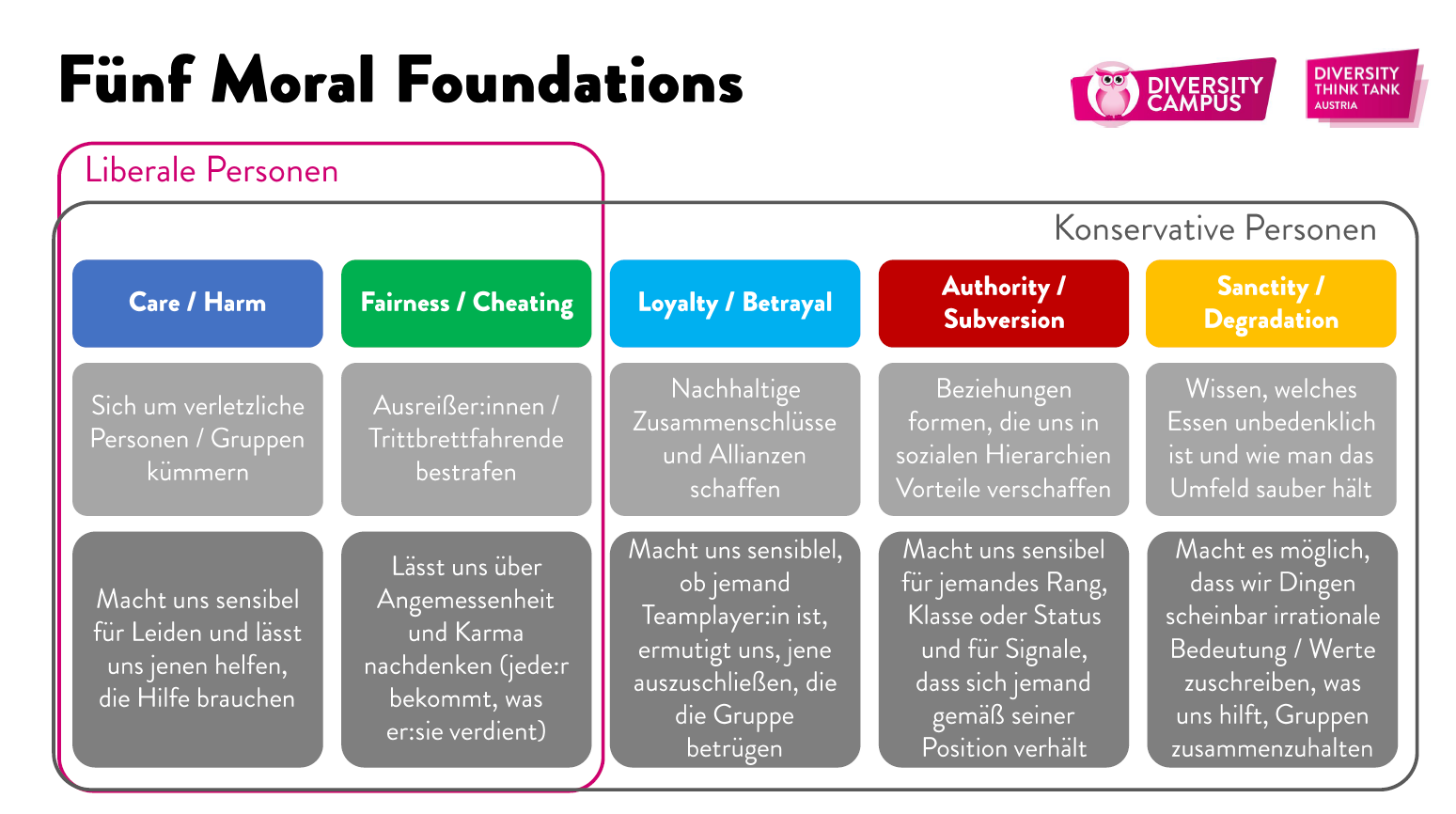 Abschließend stellte Peter Rieder die „Moral Foundations Theorie“ des US-Moralpsychologen Jonathan Haidt vor. Sie gibt Aufschluss darüber, wie Menschen moralische Urteile fällen und warum sich Liberale und Konservative in Diskussion so schlecht treffen. Wenn wir wissen, welche moralischen Grundfeste die Argumentationen jeweils stützen, dann können wir dies in der Sprache entsprechend berücksichtigen und so, von vorne herein Gegenwind vermeiden.