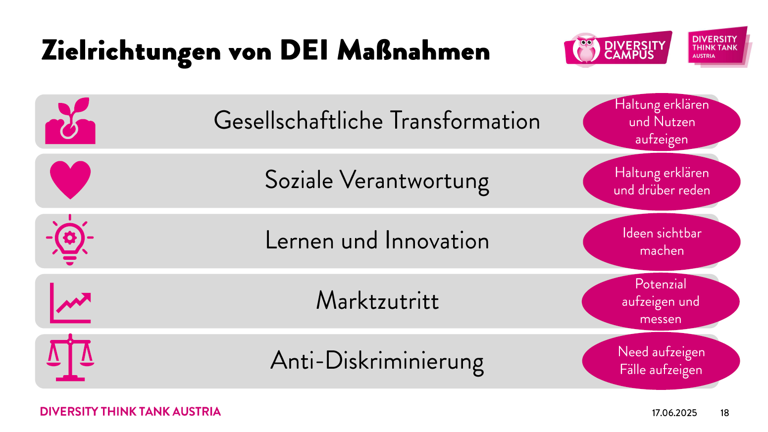Im Einstiegsimpuls zeigte uns Peter Rieder (Diversity Think Tank) neben einem kurzen historischen Abriss über die Entwicklung von DEI in den USA vor allem fünf konkrete Learnings, die Unternehmen aktuell beherzigen sollten, um ihre DEI Aktivitäten entsprechend abzusichern: