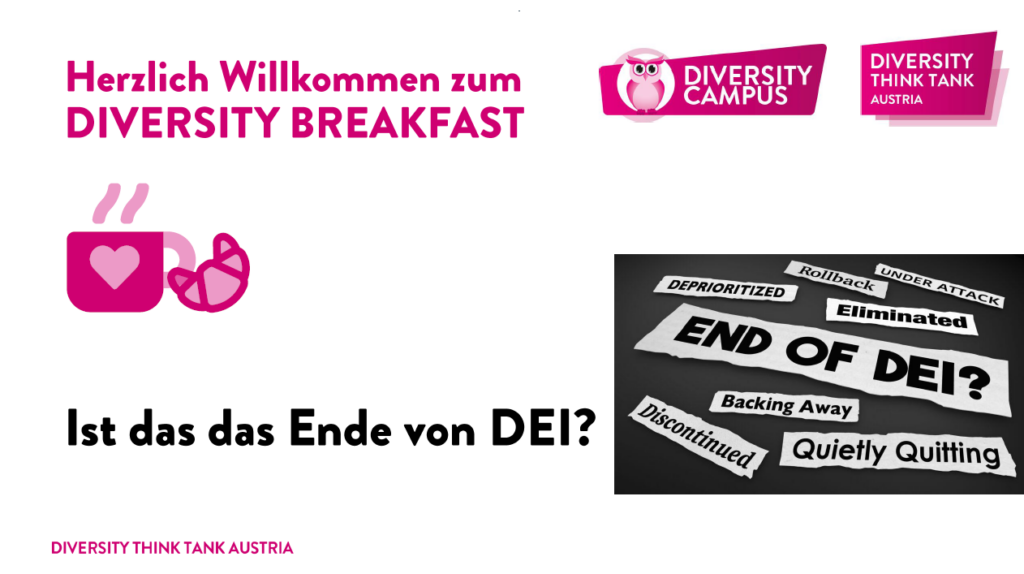 Im dritten Diversity Breakfast 2025 haben wir uns mit der Frage auseinandergesetzt, wie sich der derzeitige Gegenwind, den DEI aus den USA kommend erfährt, auf Unternehmen im DACH-Raum auswirkt. Ist das das Ende von DEI? Oder gibt es Strategien und Learning, die wir entgegen halten können?